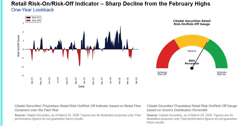 Meanwhile, sentiment surveys have collapsed. CNN Fear & Greed sits at 15, down 50 points from January. The AAII Bull/Bear Spread hit its lowest level in three months. Citadel’s own Retail RORO (Risk-On/Risk-Off) indicator has declined sharply from February highs.