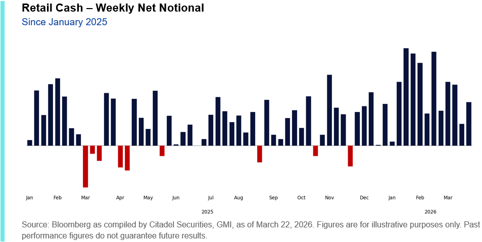 Citadel’s own flow data shows January 2026 was the largest net buying month on record on their platform, going back to the meme stock era. February, despite the war starting on the 28th, still ranked as the fifth-largest net buying month ever. Average daily net notional on Citadel’s retail platform is running roughly 60% above last year, 25% above the prior peak in 2021, and double the 2020-2025 average.